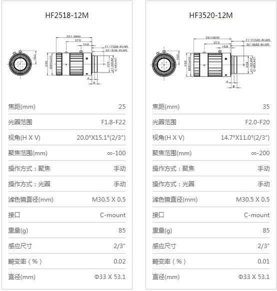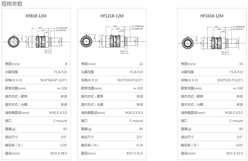 Fujinon 超高清1200万像素 HF-12M系列产品概述: “FUJINON HF-12M系列”镜头作为制造生产线产品检查及测量中所使用的机器视觉摄像机镜头的高端系列,对应2/3型感应器・2.7μm像素间距,可在多样的安装条件下实现图像由中心至外围的均一平稳的高解像性能。产品线中有焦距不同的5款机型,用户可根据不同的用途,选取合适的焦距和视角。